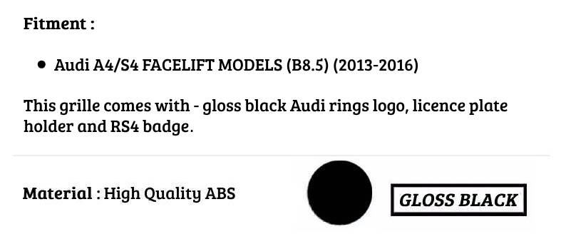 Fitment: Audi A4/S4 FACELIFT MODELS (B8.5) (2013-2016) This grille comes with - gloss black Audi rings logo, licence plate holder and RS4 badge.