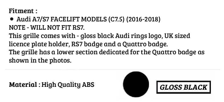 NOTE - WILL NOT FIT RS7. This grille comes with - gloss black Audi rings logo, UK sized licence plate holder, RS7 badge and a Quattro badge. The grille has a lower section dedicated for the Quattro badge as shown in the photos. The grille has a rings badge holder moulded into it, so the rings would need to be fitted i.e debadged look is not possible. The RS7 badge and the Quattro badge come in a separate pouch, so your choice if you want to stick them on the grille or not. The licence plate holder is easily removable.