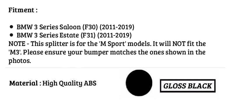 NOTE - This splitter is for the 'M Sport' models. It will NOT fit the 'M3'. Please ensure your bumper matches the ones shown in the photos.