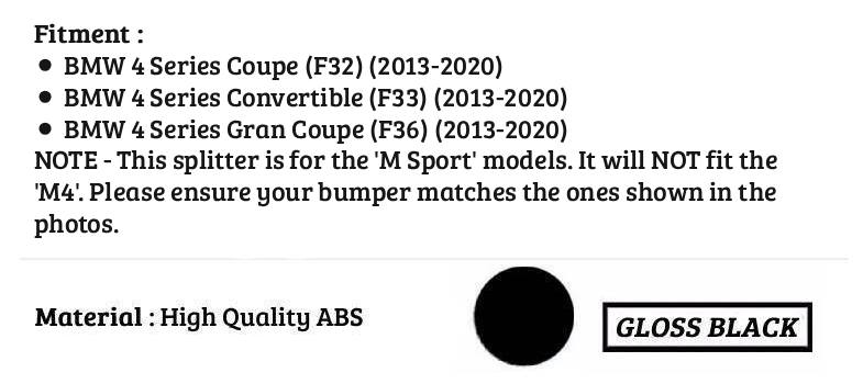 NOTE - This splitter is for the 'M Sport' models. It will NOT fit the 'M4'. Please ensure your bumper matches the ones shown in the photos.