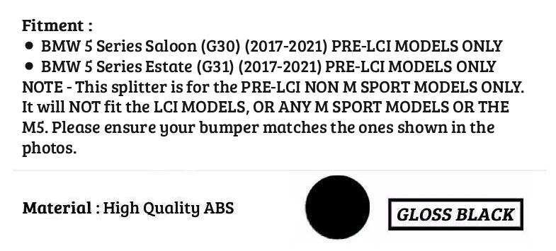 NOTE - This splitter is for the PRE-LCI NON M SPORT MODELS ONLY. It will NOT fit the LCI MODELS, OR ANY M SPORT MODELS OR THE M5. Please ensure your bumper matches the ones shown in the photos.