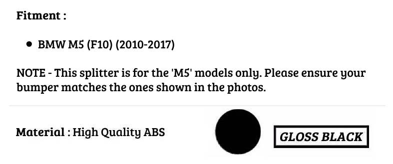 NOTE - This splitter is for the 'M5' models only. Please ensure your bumper matches the ones shown in the photos.
