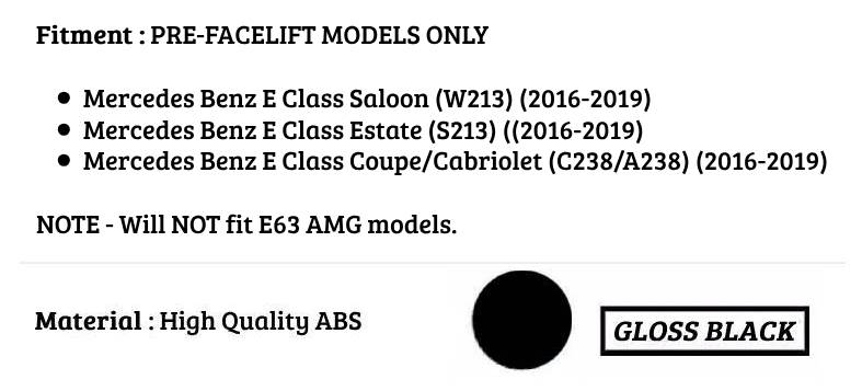 Fitment: PRE-FACELIFT MODELS ONLY Mercedes Benz E Class Saloon (W213) (2016-2019), Mercedes Benz E Class Estate (S213) ((2016-2019), Mercedes Benz E Class Coupe/Cabriolet (C238/A238) (2016-2019)